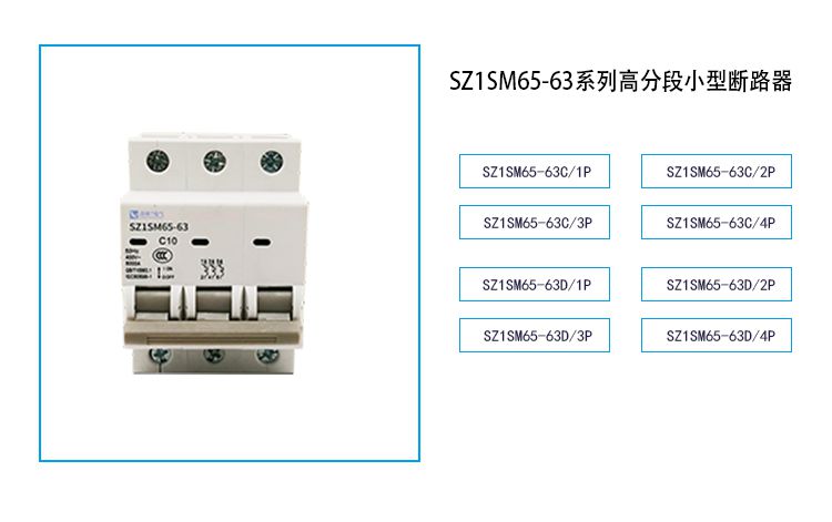 SZ1SM65-63⾼分断⼩型断路器。具有结构先进合理、性能可靠、分断能⼒⾼、外型美观⼩巧等特点,壳体等部件采⽤耐冲击、⾼阻燃材料构成。适⽤于交流50Hz或6OHz,额定⼯作电压400Vv以下,额定电流⾃6A⾄63A以下的场所。主要⽤于办公楼、住宅和类似的建筑物的照明、配电线路及没备的过载、短路保护,也可在正常情况下,作为线路不频繁分断和转换之⽤。